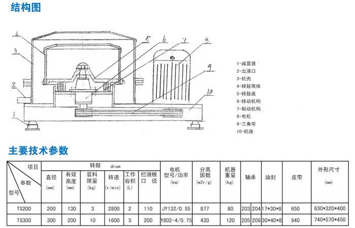 该离心机是应用转鼓高速回转所产生的离心力场,吧悬浮液或其他物流中的固相与液相分离开来。粉粒物料进入转鼓内后,物料在离心力场作用下,趋向转鼓壁,液相经覆盖于转鼓内壁的过滤介质穿过转鼓滤孔,趋向机壳空间,落入机体底盘,经出液口排出,而固相物料存留在转鼓内,完成固液分离。